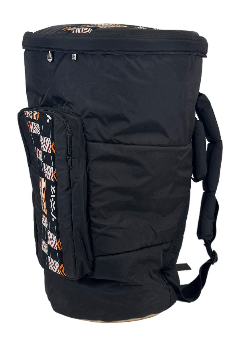 This is a great introductory level djembe case. We recommend this case for the budget conscious and those needing lightweight protection of their djembe. This case is made and designed in Guinea. It features backpack straps and zippered pockets as well as a carrying handle.