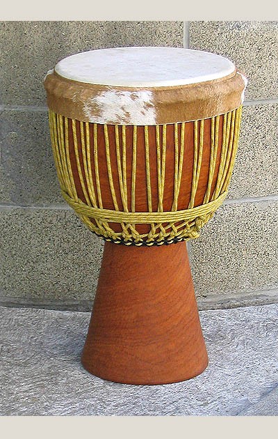 This is a Lenke wood djembe from Mali. The shell is very solid and very well carved. The combination of the shell, and the medium thick goat skin that we headed this djembe with, creates a great all around djembe. The tones and bass are deep which make it ideal for accompaniment, and the slaps are clean and clear which make it great for solo as well. This djembe can be subtle or loud for solo which make it an excellent all around djembe.