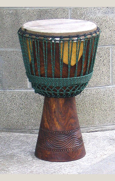 This is a very nice Haré wood djembe from Mali that we headed with a thick goat skin from Senegal. We used three top rings and pulled the skin tight which gives this djembe a quick, solid feel. This is a great djembe to be cranked and used as a solo "popper" due to it's dimensions and thick skin, or tuned tight and used for accompaniment and some solo. A very nice djembe all the way around.