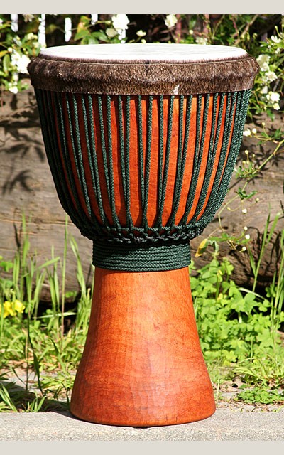 DSD Comment: Classy djembe with a classic mali shape! In general Mali drums come off having a larger bass and tone than other djembes. That said, this one has it all! This is a flawless drum! This djembe doesn't need all the flashy decorations. The quality of this one is evident in the wood.
