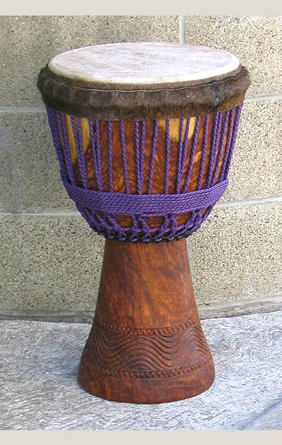 This is a very solid Haré wood djembe from Mali. We headed this drum with a lighter medium goat skin from Mali. The combination gives this djembe a clean crisp sound with a drier slap and great tone and bass. This is a very good all around djembe.
