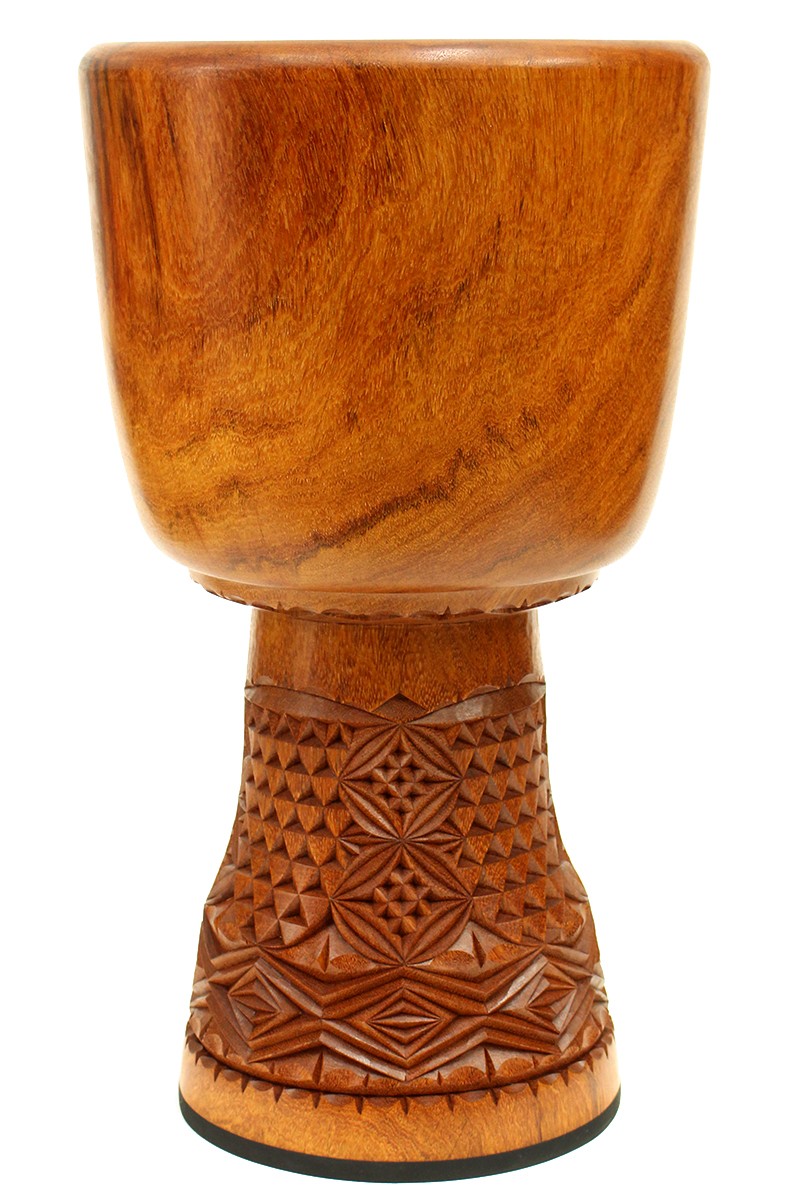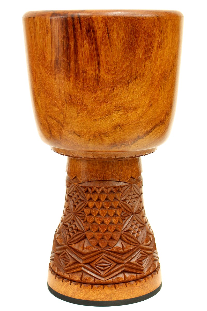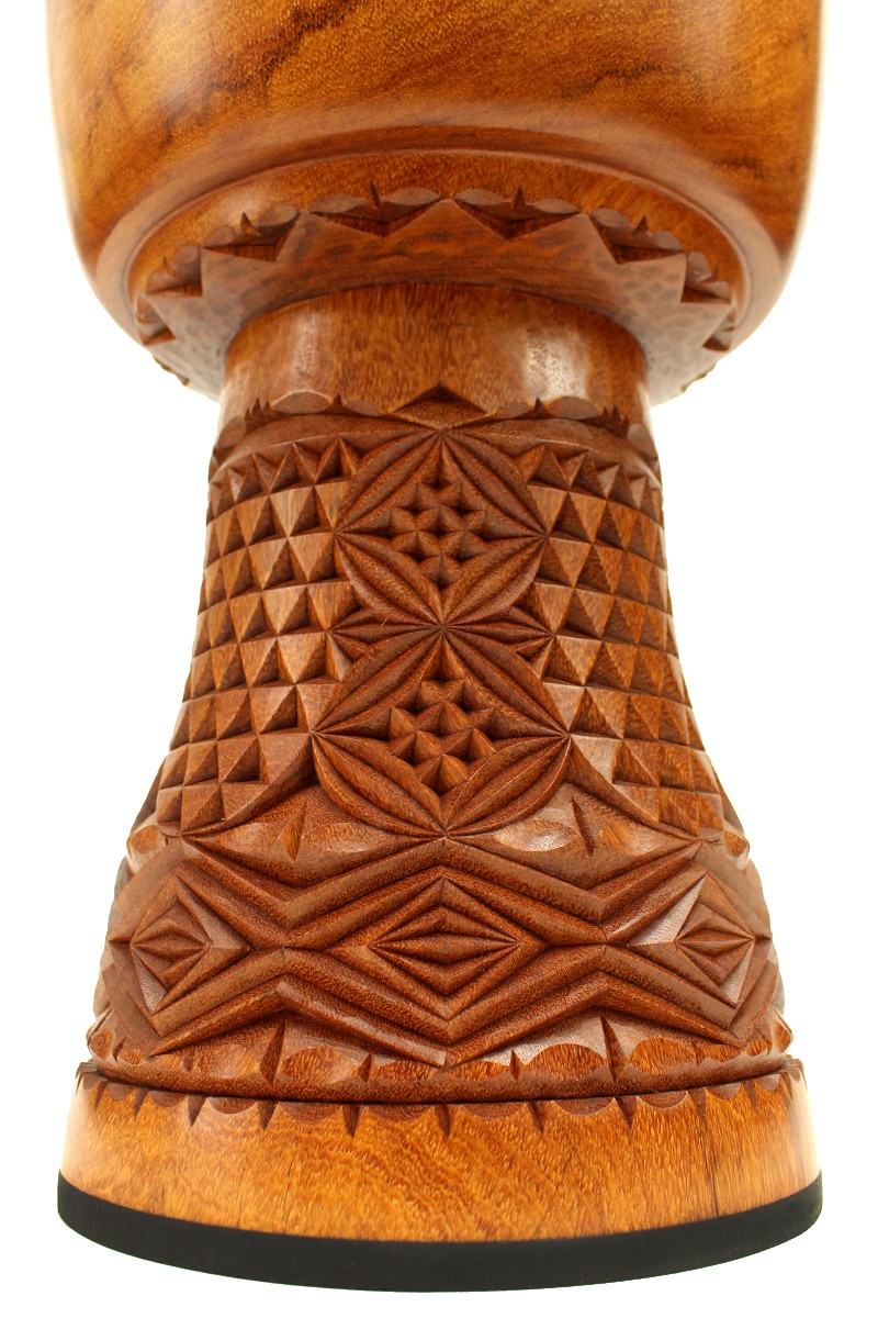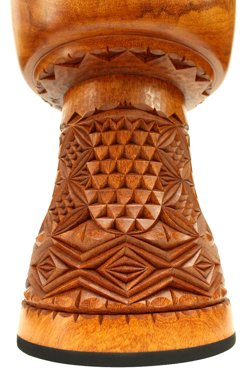 The decorative carving on this djembe shell was carved by the extremely talented Mohamed Kaleb Sylla in Conakry, Guinea, Africa.