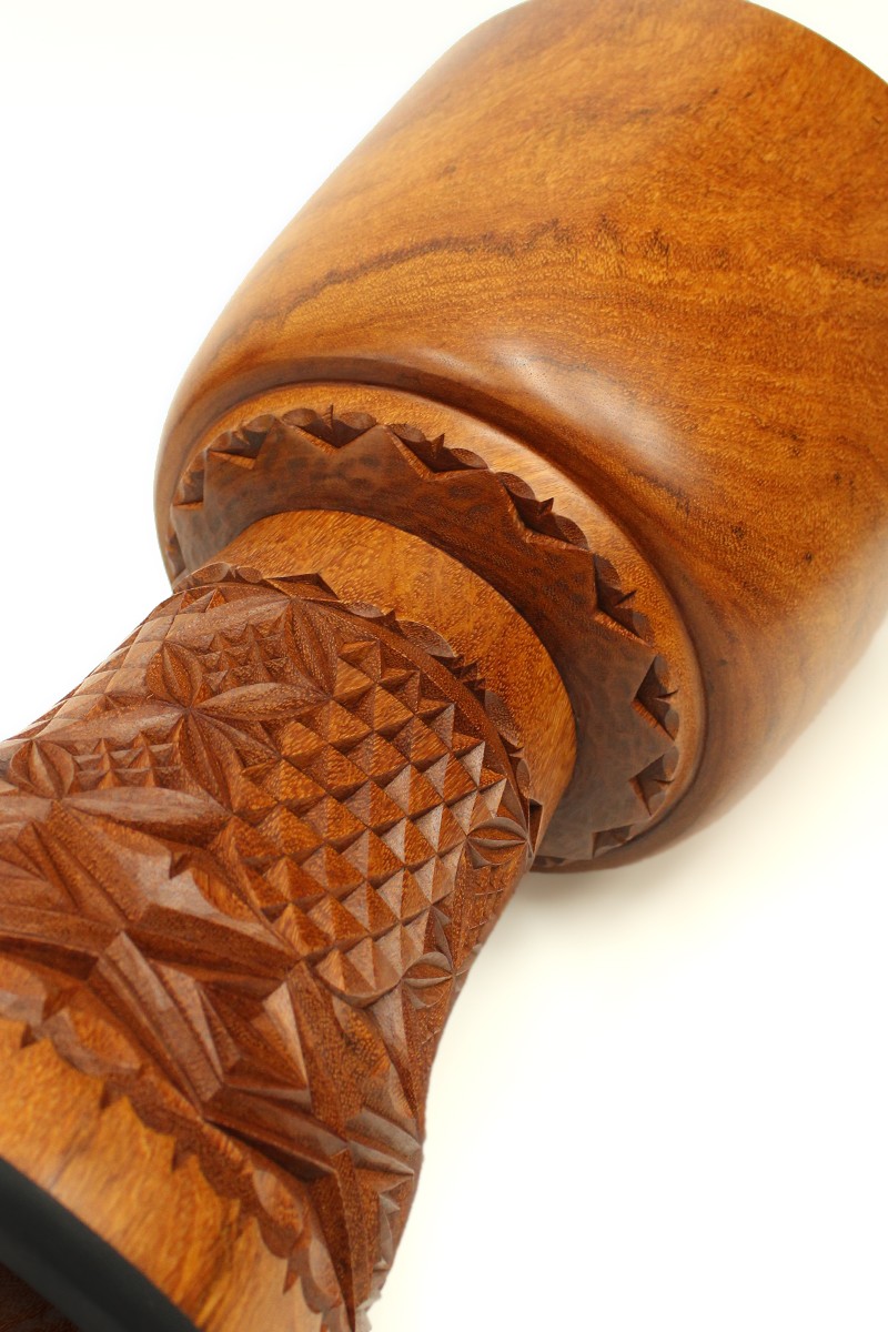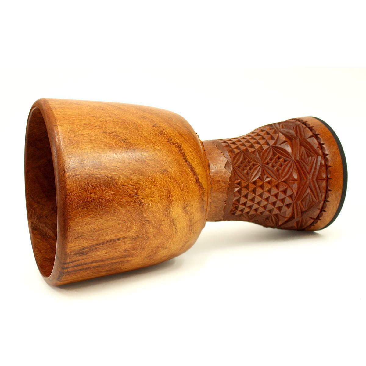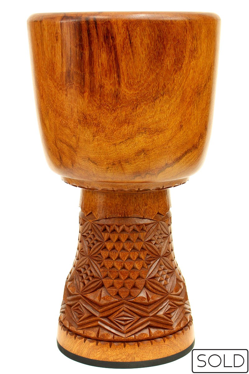 The decorative carving on this djembe shell was carved by the extremely talented Mohamed Kaleb Sylla in Conakry, Guinea, Africa.