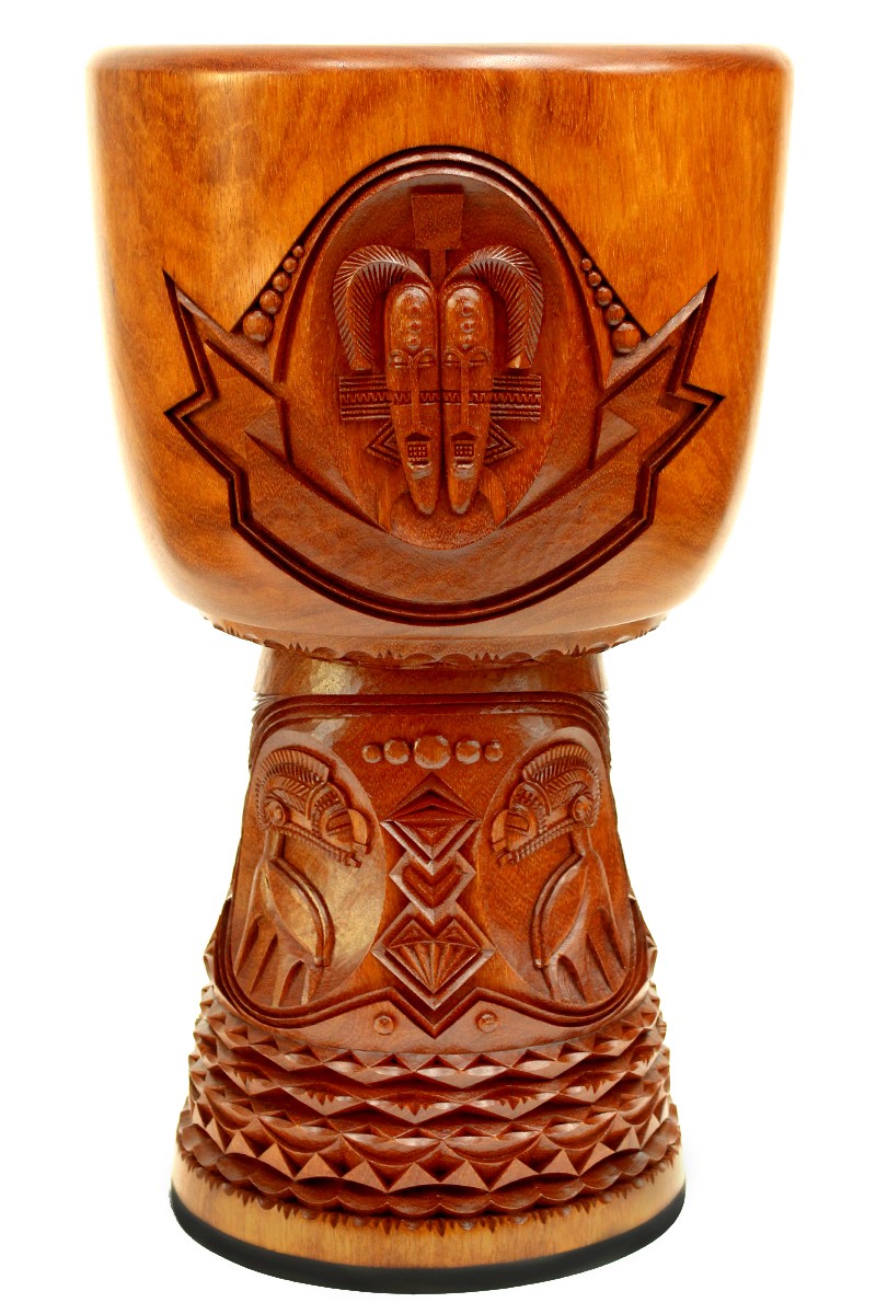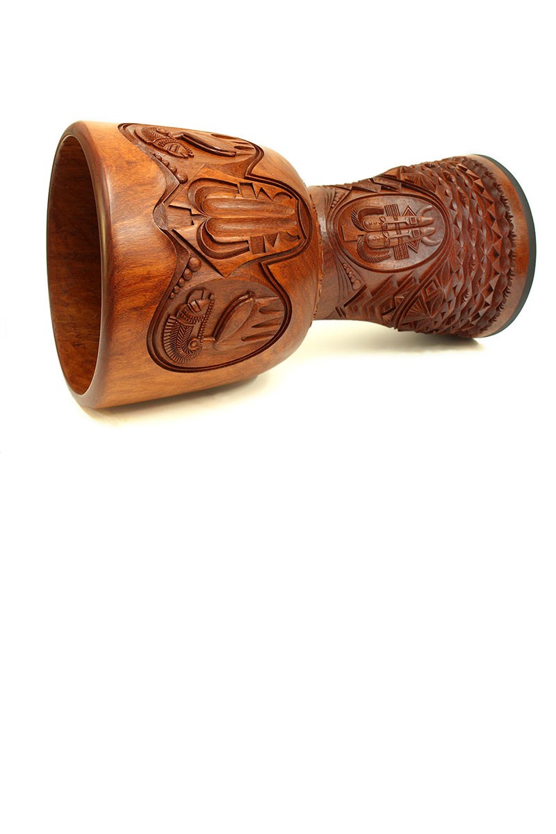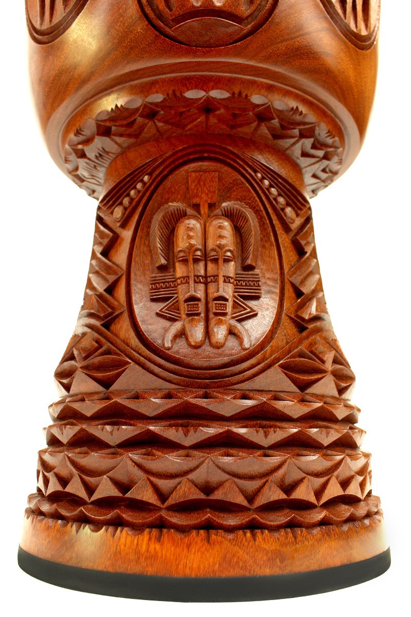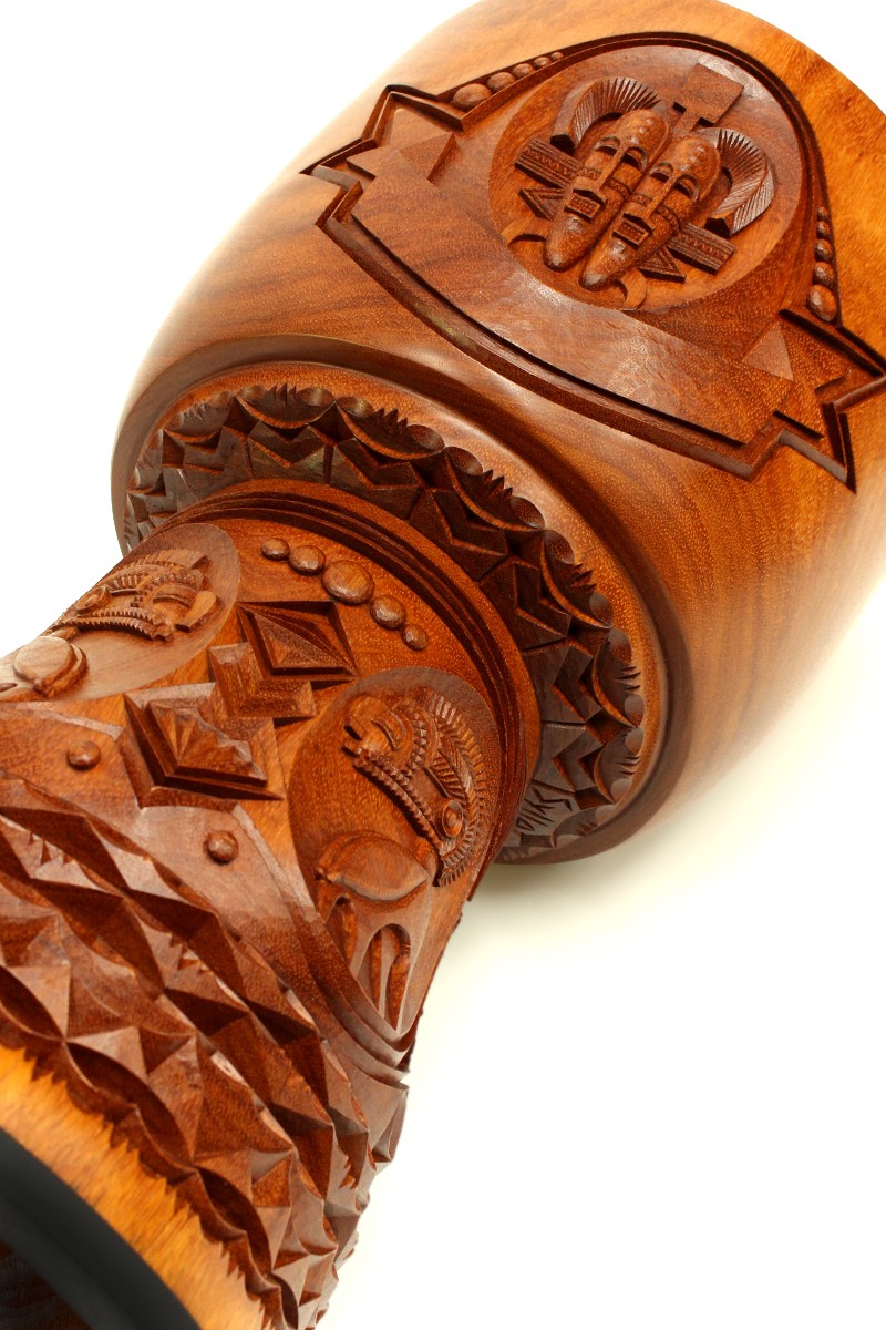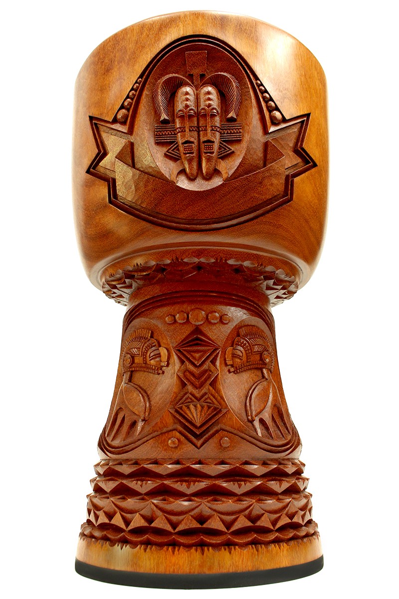The decorative carving on this djembe shell was carved by the extremely talented Mohamed Kaleb Sylla in Conakry, Guinea, Africa.