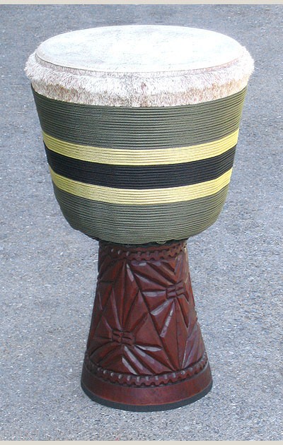 This Djembe is the SUPER DELUXE!! We started with a very unique Djalla wood shell from Guinea. The shell is very nice with great proportions and thick walls. The decoration carved into the stem/base is very well done and a "one of a kind" work of art.