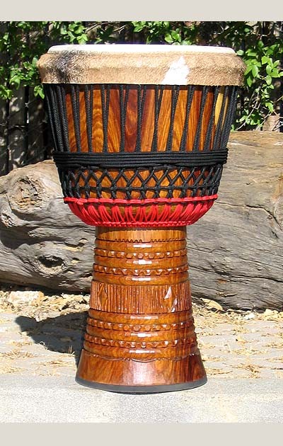 This is a beautiful djembe from Guinea that's got all the bells and whistles! We headed it with a heavy medium goat skin and tuned it up for solo. It also has a protective rubber bottom (an $80 value) and extended girth hitches on the bottom ring (a $50 value).
