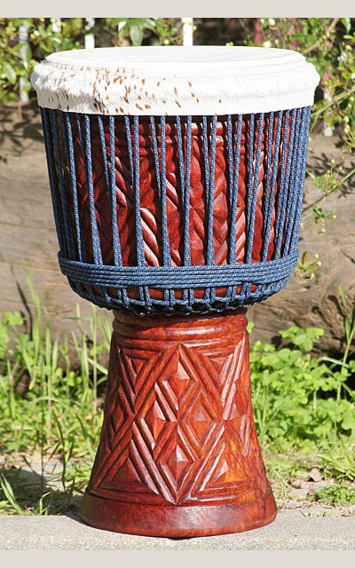 DSD Comment: This doubly carved djembe is choice! What stands out about this one is that the bowl was carved extra thick therefore the shell maintained exceptional integrity with the added decoration. This djembe has a thick white spotty skin to add to it's already over the top look. Great sounding, super responsive drum! This djembe has a woody, sweet, melodic sound.