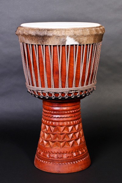 DSD Comment:  This is an exceptional drum and an exceptional deal! The reason we have marked this drum down is because there are a few spots on the stem of the drum where the decoration was carved too deep leaving the wood very thin in those areas. The problem areas have been reinforced and there is no structural concern for the buyer. This is a professional caliber djembe!