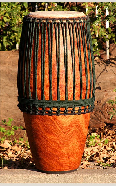 This is a hand carved, solid shell Conga. We professionally headed this drum with a thick cow skin from Guinea and tuned it to our specifications. This combination created a conga that plays like the familiar hardware tuned congas, but it has more of a raw, earthy feel resulting from its solid shell, non-processed cow skin and rope tuning.