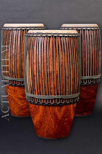 This solid shell conga set is hand carved in Mali from Haré (Guéni) wood. We professionally headed these drums with thick cow skins from Guinea and tuned them to our specifications. These drums plays like the familiar hardware tuned congas, but they have more of a raw, earthy feel resulting from the solid shell, non-processed cow skin and rope tuning. These drums are extremely responsive and vocal and will rival any professional quality congas on the market.