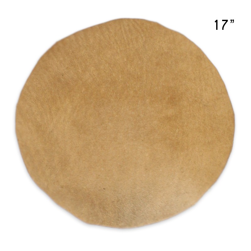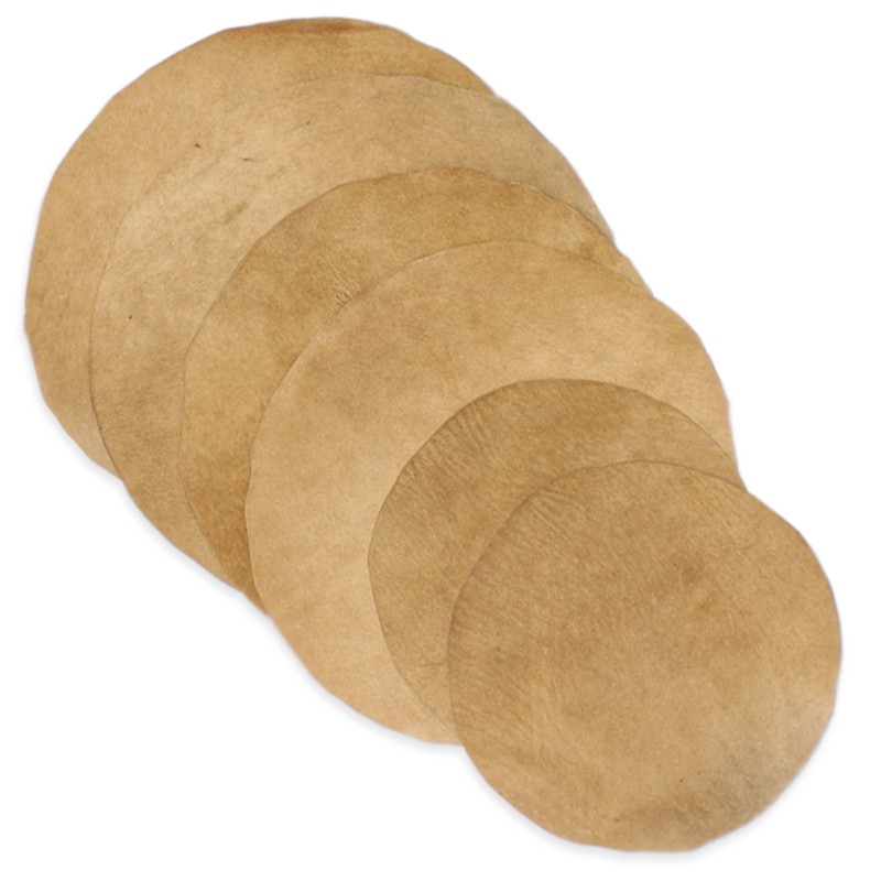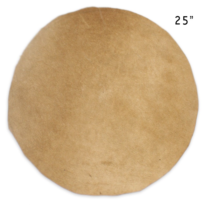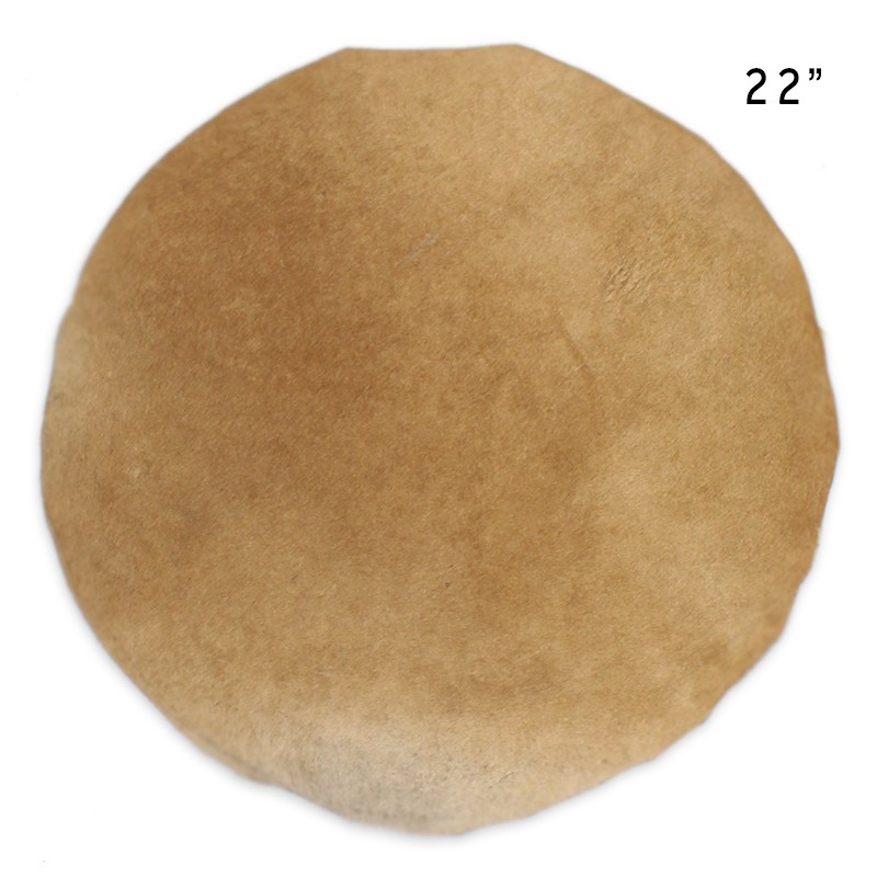 These are cow skin rounds, with hair, that are cut out of full cow hide ,from Guinea. We love these cow skins because they produce such sweet sound, and they have a great thickness-to-strength ratio. These skins are typically thinner than American cow skins, however they sound better and tend to last longer. We use these same skins on all of our Dununs and Congas, as well as some Djembes and Ngomas.