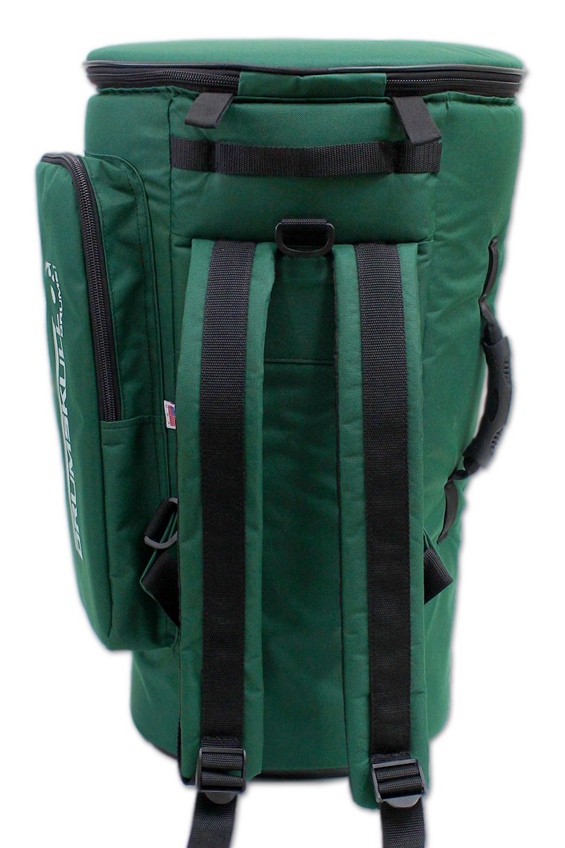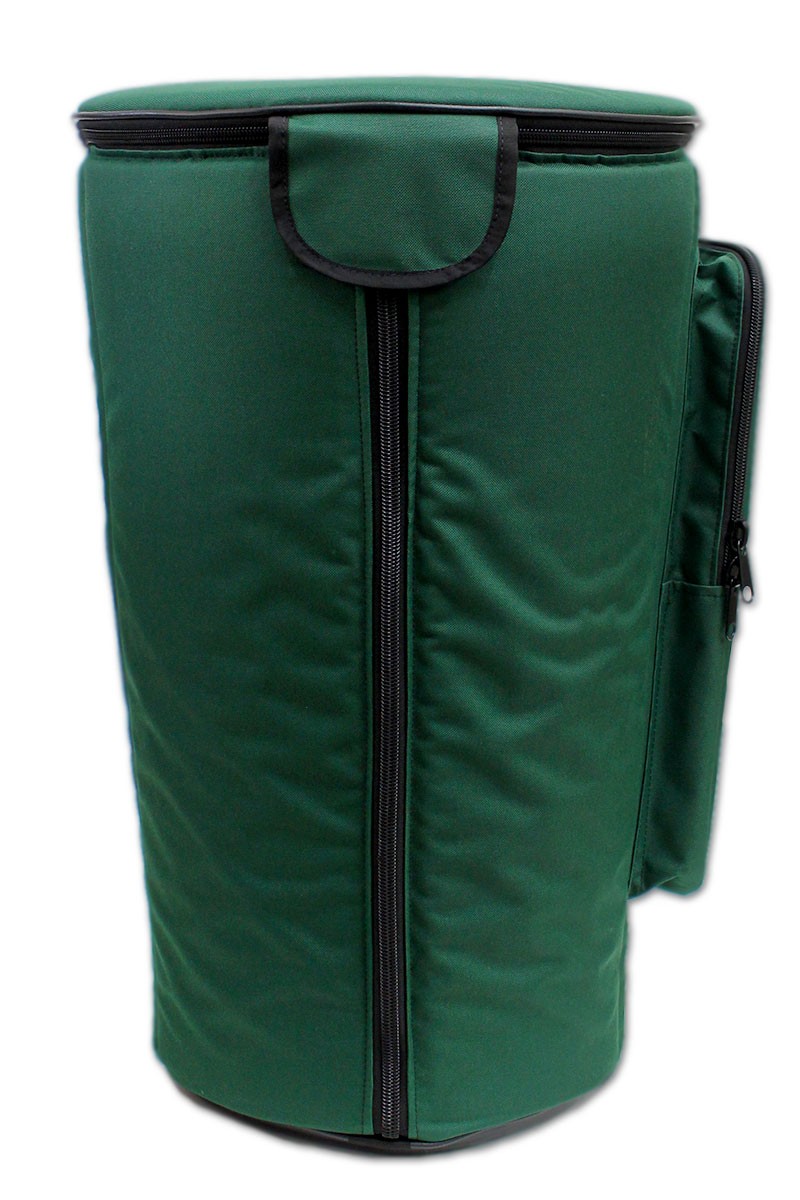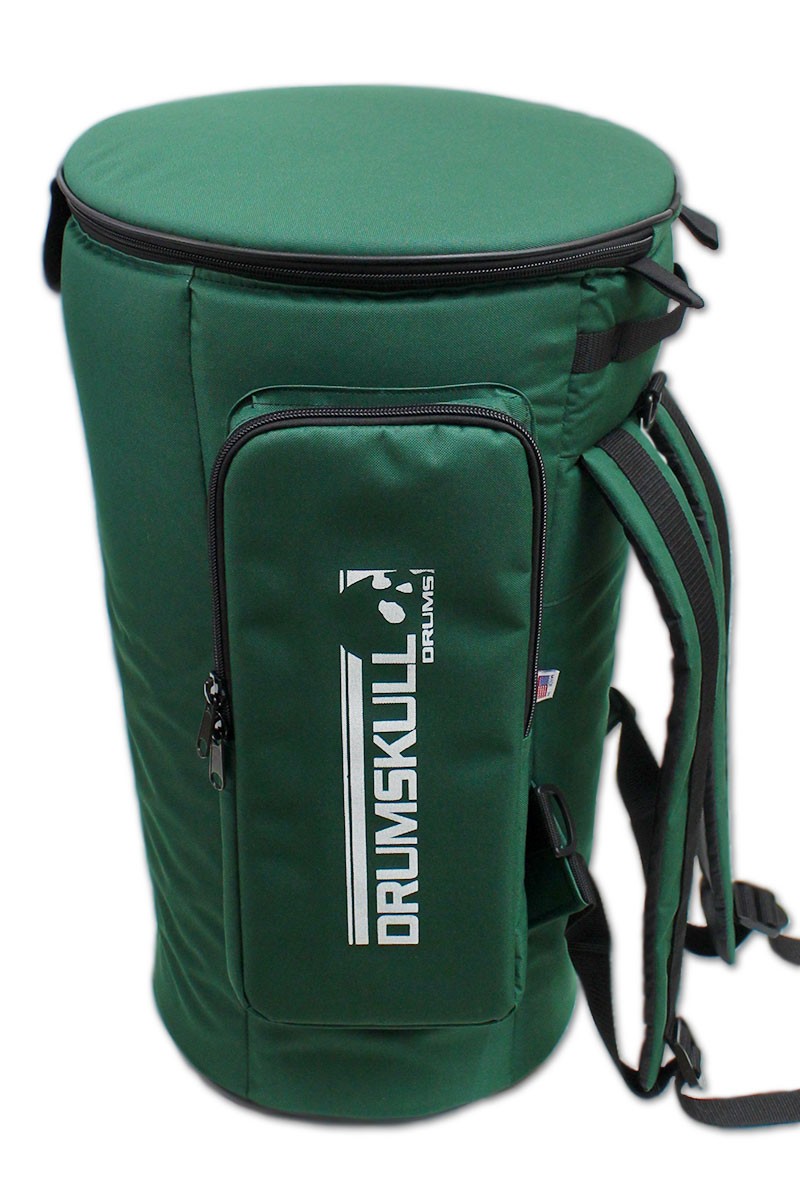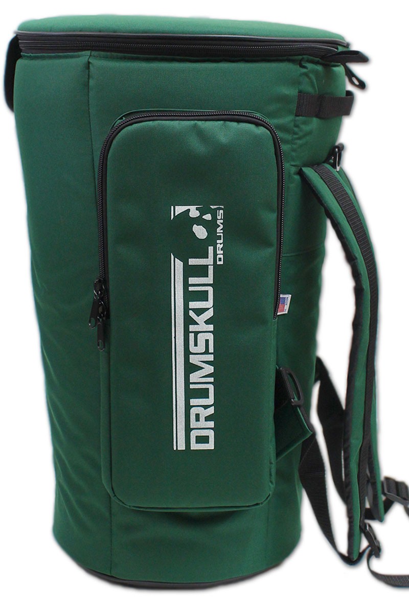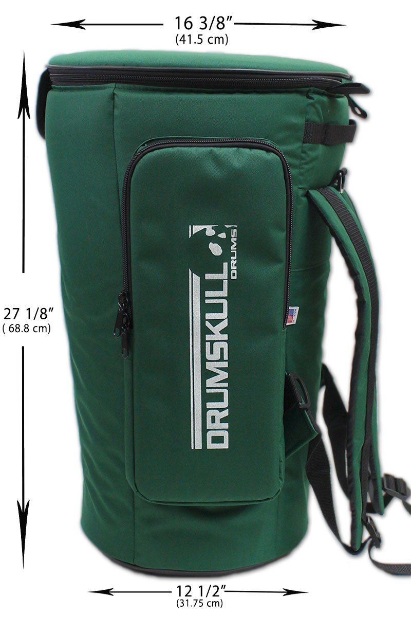 This is a heavy-duty djembe case custom designed by DrumSkull Drums. It is our Limited Edition design, which adds extra back support and cushioning for easy comfortable carrying. Due to its solid construction, this is the ideal case for the person that frequently transports or travels with their drum. In addition to this, we have added an extra layer of protection on the top. It is the best way to protect the skin and wood from damage due to inconsistent weather and changing temperature. This is not your basic dust cover. It comes equipped with double thick padding, padded back pack straps, a handle and a roomy side pocket. It has a three-zipper, easy in/out system. In addition to this, the bag will not fold while you put your drum into it. It is designed to be stiff so that it stands upright and keeps it shape. We believe this to be the best djembe case available, and therefore the best way to protect your instrument.