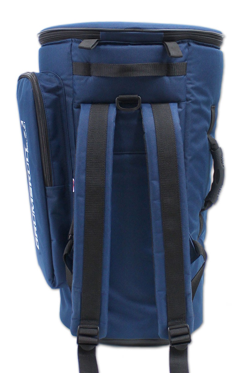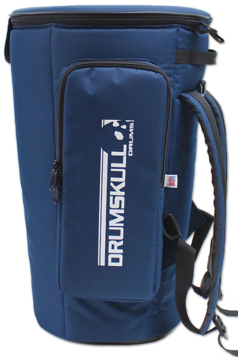 This is a heavy-duty djembe case custom designed by DrumSkull Drums. It is our Limited Edition design, which adds extra back support and cushioning for easy comfortable carrying. Due to its solid construction, this is the ideal case for the person that frequently transports or travels with their drum. In addition to this, we have added an extra layer of protection on the top. It is the best way to protect the skin and wood from damage due to inconsistent weather and changing temperature. This is not your basic dust cover. It comes equipped with double thick padding, padded back pack straps, a handle and a roomy side pocket. It has a three-zipper, easy in/out system. In addition to this, the bag will not fold while you put your drum into it. It is designed to be stiff so that it stands upright and keeps it shape. We believe this to be the best djembe case available, and therefore the best way to protect your instrument.