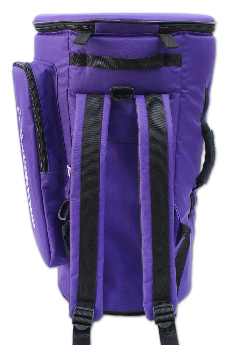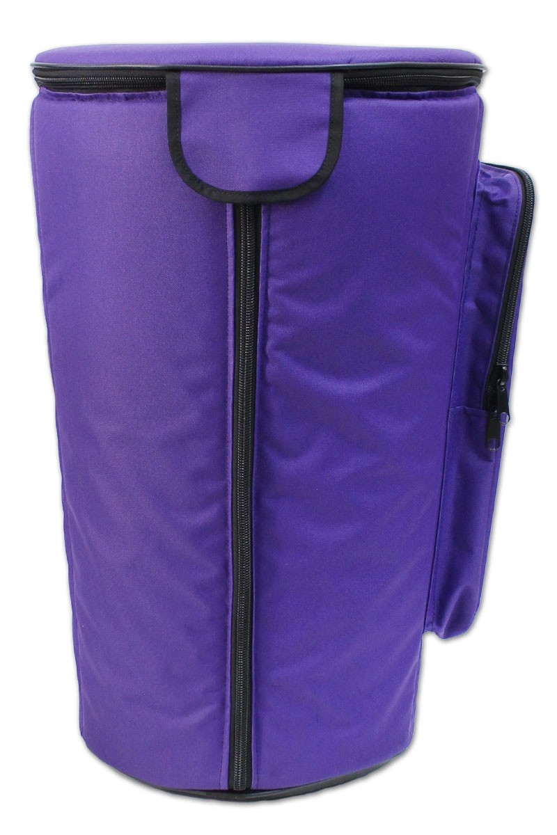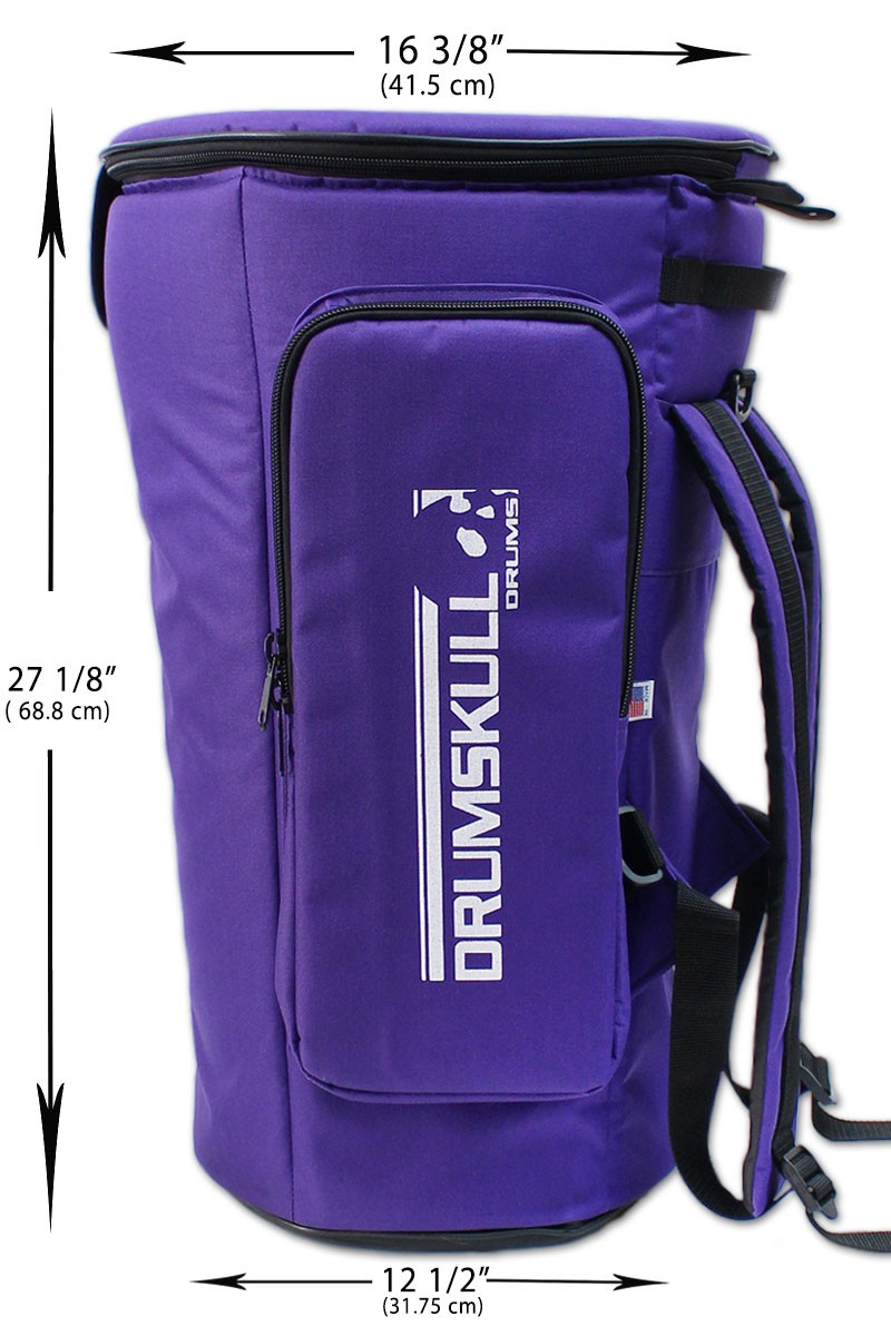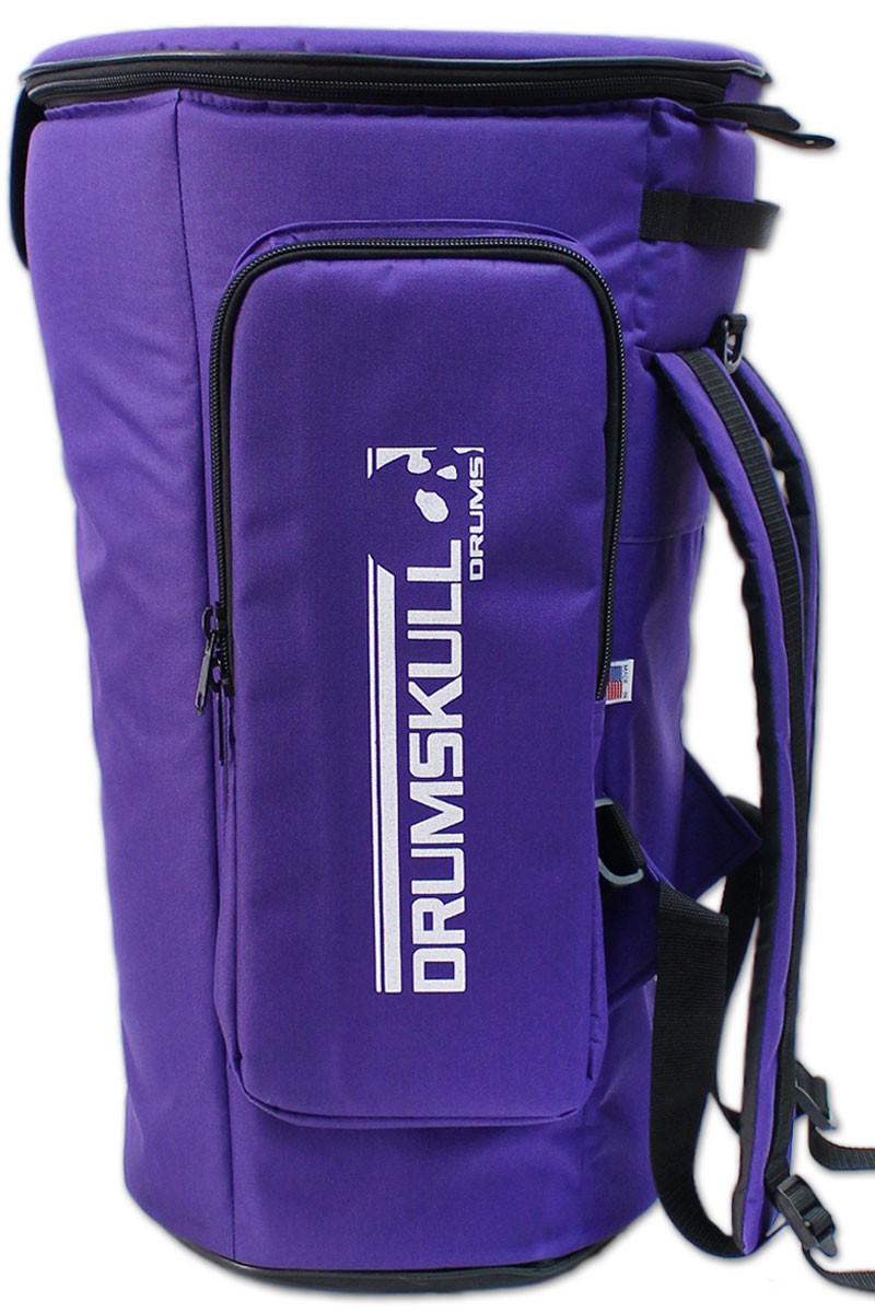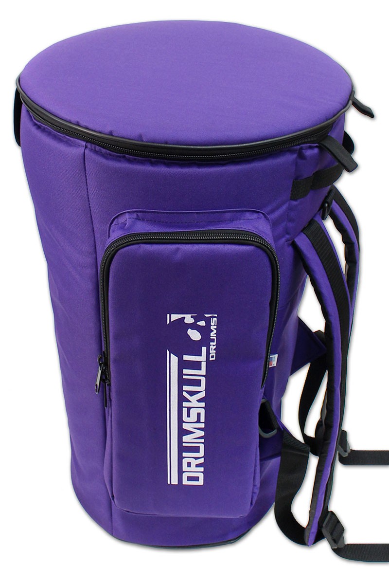 This is a heavy-duty djembe case custom designed by DrumSkull Drums. It is our Limited Edition design, which adds extra back support and cushioning for easy comfortable carrying. Due to its solid construction, this is the ideal case for the person that frequently transports or travels with their drum. In addition to this, we have added an extra layer of protection on the top. It is the best way to protect the skin and wood from damage due to inconsistent weather and changing temperature. This is not your basic dust cover. It comes equipped with double thick padding, padded back pack straps, a handle and a roomy side pocket. It has a three-zipper, easy in/out system. In addition to this, the bag will not fold while you put your drum into it. It is designed to be stiff so that it stands upright and keeps it shape. We believe this to be the best djembe case available, and therefore the best way to protect your instrument.