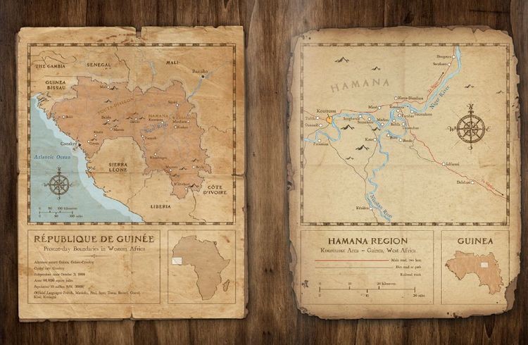 Djoliba Crossing features a series of hand-drawn, historical maps. Some of these maps include: