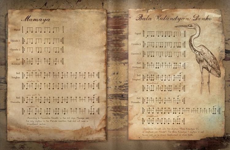 Included in Djoliba Crossing are djembe and dunun (sangban, dununba, kenkeni) rhythm notations for the following pieces of music:
