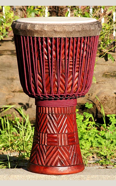 DSD Comment: Famoudou Fans alert! This drum has a medium skin on it giving it that classic Famoudou sound. If thats the sound you seek, consider this beauty! This is a great all around drum with a good balance between bass, tone and slap. A perfect piece of Djalla wood with no sap wood and an exceptional decoration!