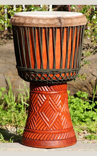 DSD Comment: One of the cleanest carved shells available! Killer decoration on this one. This is super responsive all around drum with a thicker medium skin on it. Tune it high for solo play or keep it in the mid range for a big bass and tone. This is a perfect djembe in all ways!